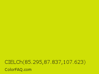 CIELCh 85.295,87.837,107.623 Color is a normal yellow color and the nearest color is Bitter Lemon #cae00d. Hex code #cfe005 and RGB value is rgb(207,224,5). In RGB color space, this color is composed of 81% red, 88% green, 2% blue, In CMYK color space, this color is composed of 8% cyan, 0% magenta, 98% yellow , 12% black , In HSL color space, this color has a hue angle of 65° , 96% saturation and 45% lightness.