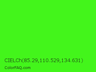CIELCh 85.29,110.529,134.631 Color is a normal green color and the nearest color is Neon Green #39ff14. Hex code #43f51b and RGB value is rgb(67,245,27). In RGB color space, this color is composed of 26% red, 96% green, 11% blue, In CMYK color space, this color is composed of 73% cyan, 0% magenta, 89% yellow , 4% black , In HSL color space, this color has a hue angle of 109° , 92% saturation and 53% lightness.