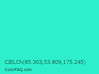CIELCh 85.303,53.809,175.245 Color is a normal cyan color and the nearest color is Turquoise #40e0d0. Hex code #2defcb and RGB value is rgb(45,239,203). In RGB color space, this color is composed of 18% red, 94% green, 80% blue, In CMYK color space, this color is composed of 81% cyan, 0% magenta, 15% yellow , 6% black , In HSL color space, this color has a hue angle of 169° , 86% saturation and 56% lightness.
