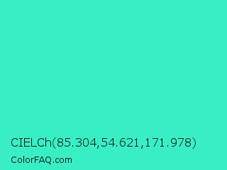 CIELCh 85.304,54.621,171.978 Color is a normal cyan color and the nearest color is Turquoise #40e0d0. Hex code #38efc5 and RGB value is rgb(56,239,197). In RGB color space, this color is composed of 22% red, 94% green, 77% blue, In CMYK color space, this color is composed of 77% cyan, 0% magenta, 18% yellow , 6% black , In HSL color space, this color has a hue angle of 166° , 85% saturation and 58% lightness.
