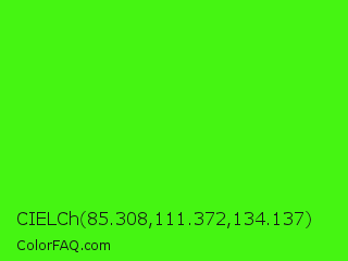 CIELCh 85.308,111.372,134.137 Color is a normal green color and the nearest color is Neon Green #39ff14. Hex code #45f512 and RGB value is rgb(69,245,18). In RGB color space, this color is composed of 27% red, 96% green, 7% blue, In CMYK color space, this color is composed of 72% cyan, 0% magenta, 93% yellow , 4% black , In HSL color space, this color has a hue angle of 107° , 92% saturation and 52% lightness.