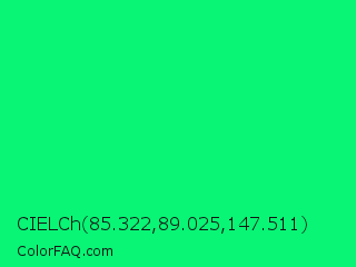 CIELCh 85.322,89.025,147.511 Color is a normal green color and the nearest color is Spring Green #00ff7f. Hex code #08f575 and RGB value is rgb(8,245,117). In RGB color space, this color is composed of 3% red, 96% green, 46% blue, In CMYK color space, this color is composed of 97% cyan, 0% magenta, 52% yellow , 4% black , In HSL color space, this color has a hue angle of 148° , 94% saturation and 50% lightness.