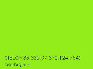 CIELCh 85.331,97.372,124.764 Color is a normal green color and the nearest color is Spring Frost #87ff2a. Hex code #91ed19 and RGB value is rgb(145,237,25). In RGB color space, this color is composed of 57% red, 93% green, 10% blue, In CMYK color space, this color is composed of 39% cyan, 0% magenta, 89% yellow , 7% black , In HSL color space, this color has a hue angle of 86° , 85% saturation and 51% lightness.