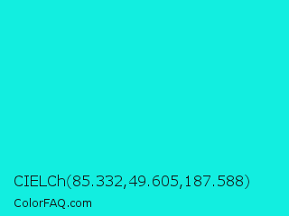 CIELCh 85.332,49.605,187.588 Color is a normal cyan color and the nearest color is Bright Turquoise #08e8de. Hex code #12eee0 and RGB value is rgb(18,238,224). In RGB color space, this color is composed of 7% red, 93% green, 88% blue, In CMYK color space, this color is composed of 92% cyan, 0% magenta, 6% yellow , 7% black , In HSL color space, this color has a hue angle of 176° , 87% saturation and 50% lightness.