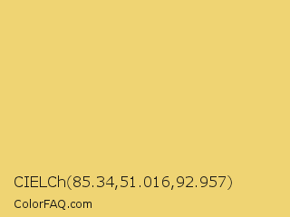 CIELCh 85.34,51.016,92.957 Color is a light yellow color and the nearest color is Hansa Yellow #e9d66b. Hex code #efd473 and RGB value is rgb(239,212,115). In RGB color space, this color is composed of 94% red, 83% green, 45% blue, In CMYK color space, this color is composed of 0% cyan, 11% magenta, 52% yellow , 6% black , In HSL color space, this color has a hue angle of 47° , 79% saturation and 69% lightness.
