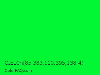 CIELCh 85.383,110.395,138.4 Color is a normal green color and the nearest color is Vivid Malachite #00cc33. Hex code #00f733 and RGB value is rgb(0,247,51). In RGB color space, this color is composed of 0% red, 97% green, 20% blue, In CMYK color space, this color is composed of 100% cyan, 0% magenta, 79% yellow , 3% black , In HSL color space, this color has a hue angle of 132° , 100% saturation and 48% lightness.