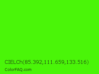 CIELCh 85.392,111.659,133.516 Color is a normal green color and the nearest color is Chlorophyll Green #4aff00. Hex code #4af508 and RGB value is rgb(74,245,8). In RGB color space, this color is composed of 29% red, 96% green, 3% blue, In CMYK color space, this color is composed of 70% cyan, 0% magenta, 97% yellow , 4% black , In HSL color space, this color has a hue angle of 103° , 94% saturation and 50% lightness.