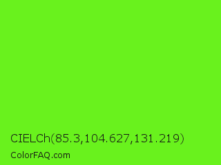 CIELCh 85.3,104.627,131.219 Color is a normal green color and the nearest color is Bright Green #66ff00. Hex code #69f21d and RGB value is rgb(105,242,29). In RGB color space, this color is composed of 41% red, 95% green, 11% blue, In CMYK color space, this color is composed of 57% cyan, 0% magenta, 88% yellow , 5% black , In HSL color space, this color has a hue angle of 99° , 89% saturation and 53% lightness.