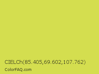 CIELCh 85.405,69.602,107.762 Color is a normal yellow color and the nearest color is Maximum Green Yellow #d9e650. Hex code #d4de4f and RGB value is rgb(212,222,79). In RGB color space, this color is composed of 83% red, 87% green, 31% blue, In CMYK color space, this color is composed of 5% cyan, 0% magenta, 64% yellow , 13% black , In HSL color space, this color has a hue angle of 64° , 68% saturation and 59% lightness.