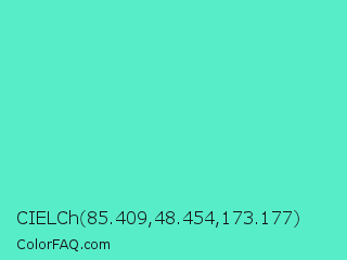 CIELCh 85.409,48.454,173.177 Color is a light cyan color and the nearest color is Turquoise #40e0d0. Hex code #57edc9 and RGB value is rgb(87,237,201). In RGB color space, this color is composed of 34% red, 93% green, 79% blue, In CMYK color space, this color is composed of 63% cyan, 0% magenta, 15% yellow , 7% black , In HSL color space, this color has a hue angle of 166° , 81% saturation and 64% lightness.