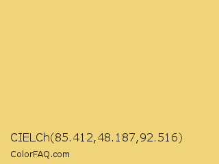 CIELCh 85.412,48.187,92.516 Color is a light yellow color and the nearest color is Golden Sand #f0db7d. Hex code #efd479 and RGB value is rgb(239,212,121). In RGB color space, this color is composed of 94% red, 83% green, 47% blue, In CMYK color space, this color is composed of 0% cyan, 11% magenta, 49% yellow , 6% black , In HSL color space, this color has a hue angle of 46° , 79% saturation and 71% lightness.