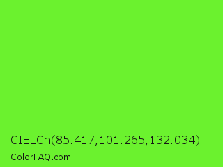 CIELCh 85.417,101.265,132.034 Color is a normal green color and the nearest color is Spring Frost #87ff2a. Hex code #6bf22e and RGB value is rgb(107,242,46). In RGB color space, this color is composed of 42% red, 95% green, 18% blue, In CMYK color space, this color is composed of 56% cyan, 0% magenta, 81% yellow , 5% black , In HSL color space, this color has a hue angle of 101° , 88% saturation and 56% lightness.