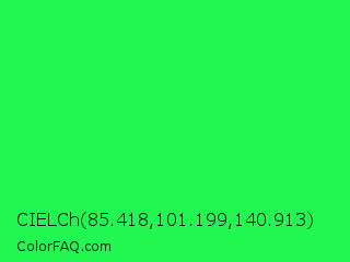 CIELCh 85.418,101.199,140.913 Color is a normal green color and the nearest color is Malachite #0bda51. Hex code #22f650 and RGB value is rgb(34,246,80). In RGB color space, this color is composed of 13% red, 96% green, 31% blue, In CMYK color space, this color is composed of 86% cyan, 0% magenta, 67% yellow , 4% black , In HSL color space, this color has a hue angle of 133° , 92% saturation and 55% lightness.