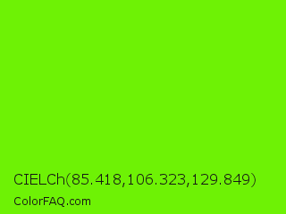 CIELCh 85.418,106.323,129.849 Color is a normal green color and the nearest color is Bright Green #66ff00. Hex code #6ef205 and RGB value is rgb(110,242,5). In RGB color space, this color is composed of 43% red, 95% green, 2% blue, In CMYK color space, this color is composed of 55% cyan, 0% magenta, 98% yellow , 5% black , In HSL color space, this color has a hue angle of 93° , 96% saturation and 48% lightness.