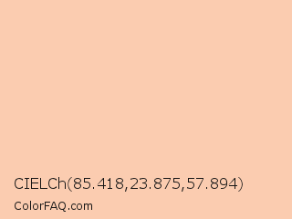 CIELCh 85.418,23.875,57.894 Color is a very light orange color and the nearest color is Apricot Peach #fbceb1. Hex code #fbccb0 and RGB value is rgb(251,204,176). In RGB color space, this color is composed of 98% red, 80% green, 69% blue, In CMYK color space, this color is composed of 0% cyan, 19% magenta, 30% yellow , 2% black , In HSL color space, this color has a hue angle of 22° , 90% saturation and 84% lightness.
