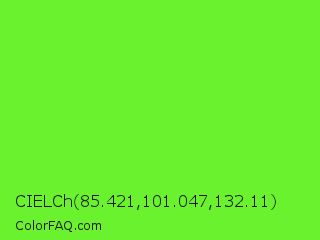 CIELCh 85.421,101.047,132.11 Color is a normal green color and the nearest color is Spring Frost #87ff2a. Hex code #6bf22f and RGB value is rgb(107,242,47). In RGB color space, this color is composed of 42% red, 95% green, 18% blue, In CMYK color space, this color is composed of 56% cyan, 0% magenta, 81% yellow , 5% black , In HSL color space, this color has a hue angle of 102° , 88% saturation and 57% lightness.