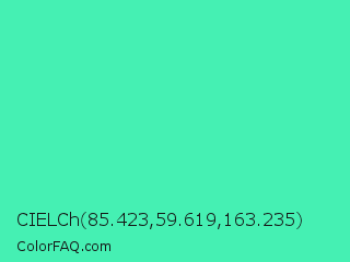 CIELCh 85.423,59.619,163.235 Color is a light green color and the nearest color is Eucalyptus #44d7a8. Hex code #45f0b3 and RGB value is rgb(69,240,179). In RGB color space, this color is composed of 27% red, 94% green, 70% blue, In CMYK color space, this color is composed of 71% cyan, 0% magenta, 25% yellow , 6% black , In HSL color space, this color has a hue angle of 159° , 85% saturation and 61% lightness.