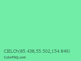 CIELCh 85.438,55.502,154.849 Color is a light green color and the nearest color is Medium Aquamarine #66ddaa. Hex code #71eda7 and RGB value is rgb(113,237,167). In RGB color space, this color is composed of 44% red, 93% green, 65% blue, In CMYK color space, this color is composed of 52% cyan, 0% magenta, 30% yellow , 7% black , In HSL color space, this color has a hue angle of 146° , 78% saturation and 69% lightness.