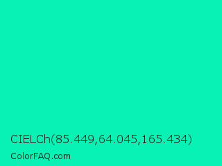 CIELCh 85.449,64.045,165.434 Color is a normal cyan color and the nearest color is Medium Spring Green #00fa9a. Hex code #08f2b5 and RGB value is rgb(8,242,181). In RGB color space, this color is composed of 3% red, 95% green, 71% blue, In CMYK color space, this color is composed of 97% cyan, 0% magenta, 25% yellow , 5% black , In HSL color space, this color has a hue angle of 164° , 94% saturation and 49% lightness.