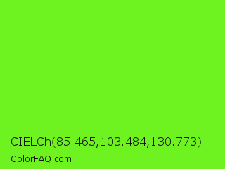 CIELCh 85.465,103.484,130.773 Color is a normal green color and the nearest color is Spring Frost #87ff2a. Hex code #6ef220 and RGB value is rgb(110,242,32). In RGB color space, this color is composed of 43% red, 95% green, 13% blue, In CMYK color space, this color is composed of 55% cyan, 0% magenta, 87% yellow , 5% black , In HSL color space, this color has a hue angle of 98° , 89% saturation and 54% lightness.