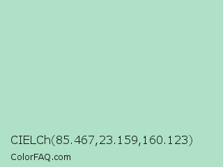 CIELCh 85.467,23.159,160.123 Color is a light green color and the nearest color is Padua #ade6c4. Hex code #aee1c6 and RGB value is rgb(174,225,198). In RGB color space, this color is composed of 68% red, 88% green, 78% blue, In CMYK color space, this color is composed of 23% cyan, 0% magenta, 12% yellow , 12% black , In HSL color space, this color has a hue angle of 148° , 46% saturation and 78% lightness.