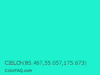 CIELCh 85.467,55.057,175.673 Color is a normal cyan color and the nearest color is Bright Turquoise #08e8de. Hex code #1cf0cc and RGB value is rgb(28,240,204). In RGB color space, this color is composed of 11% red, 94% green, 80% blue, In CMYK color space, this color is composed of 88% cyan, 0% magenta, 15% yellow , 6% black , In HSL color space, this color has a hue angle of 170° , 88% saturation and 53% lightness.