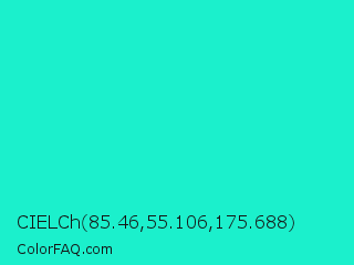CIELCh 85.46,55.106,175.688 Color is a normal cyan color and the nearest color is Bright Turquoise #08e8de. Hex code #1bf0cc and RGB value is rgb(27,240,204). In RGB color space, this color is composed of 11% red, 94% green, 80% blue, In CMYK color space, this color is composed of 89% cyan, 0% magenta, 15% yellow , 6% black , In HSL color space, this color has a hue angle of 170° , 88% saturation and 52% lightness.