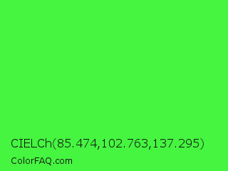 CIELCh 85.474,102.763,137.295 Color is a light green color and the nearest color is Lime Green #32cd32. Hex code #45f540 and RGB value is rgb(69,245,64). In RGB color space, this color is composed of 27% red, 96% green, 25% blue, In CMYK color space, this color is composed of 72% cyan, 0% magenta, 74% yellow , 4% black , In HSL color space, this color has a hue angle of 118° , 90% saturation and 61% lightness.