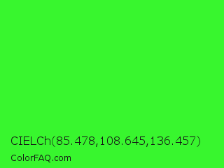 CIELCh 85.478,108.645,136.457 Color is a normal green color and the nearest color is Neon Green #39ff14. Hex code #38f62e and RGB value is rgb(56,246,46). In RGB color space, this color is composed of 22% red, 96% green, 18% blue, In CMYK color space, this color is composed of 77% cyan, 0% magenta, 81% yellow , 4% black , In HSL color space, this color has a hue angle of 117° , 92% saturation and 57% lightness.