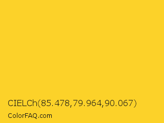 CIELCh 85.478,79.964,90.067 Color is a normal yellow color and the nearest color is Sunglow #ffcc33. Hex code #fcd229 and RGB value is rgb(252,210,41). In RGB color space, this color is composed of 99% red, 82% green, 16% blue, In CMYK color space, this color is composed of 0% cyan, 17% magenta, 84% yellow , 1% black , In HSL color space, this color has a hue angle of 48° , 97% saturation and 57% lightness.