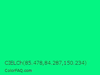 CIELCh 85.478,84.287,150.234 Color is a normal green color and the nearest color is Spring Green #00ff7f. Hex code #05f582 and RGB value is rgb(5,245,130). In RGB color space, this color is composed of 2% red, 96% green, 51% blue, In CMYK color space, this color is composed of 98% cyan, 0% magenta, 47% yellow , 4% black , In HSL color space, this color has a hue angle of 151° , 96% saturation and 49% lightness.