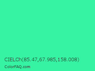 CIELCh 85.47,67.985,158.008 Color is a normal green color and the nearest color is Eucalyptus #44d7a8. Hex code #36f2a3 and RGB value is rgb(54,242,163). In RGB color space, this color is composed of 21% red, 95% green, 64% blue, In CMYK color space, this color is composed of 78% cyan, 0% magenta, 33% yellow , 5% black , In HSL color space, this color has a hue angle of 155° , 88% saturation and 58% lightness.