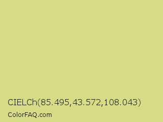 CIELCh 85.495,43.572,108.043 Color is a light yellow color and the nearest color is Medium Spring Bud #c9dc87. Hex code #d8db86 and RGB value is rgb(216,219,134). In RGB color space, this color is composed of 85% red, 86% green, 53% blue, In CMYK color space, this color is composed of 1% cyan, 0% magenta, 39% yellow , 14% black , In HSL color space, this color has a hue angle of 62° , 54% saturation and 69% lightness.