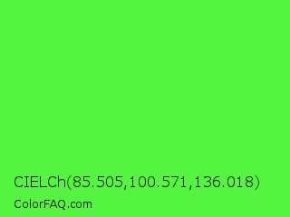 CIELCh 85.505,100.571,136.018 Color is a normal green color and the nearest color is Screamin Green #66ff66. Hex code #55f440 and RGB value is rgb(85,244,64). In RGB color space, this color is composed of 33% red, 96% green, 25% blue, In CMYK color space, this color is composed of 65% cyan, 0% magenta, 74% yellow , 4% black , In HSL color space, this color has a hue angle of 113° , 89% saturation and 60% lightness.
