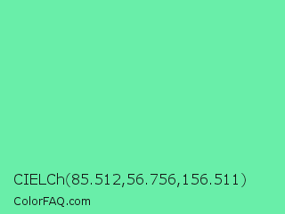 CIELCh 85.512,56.756,156.511 Color is a light green color and the nearest color is Medium Aquamarine #66ddaa. Hex code #69eea9 and RGB value is rgb(105,238,169). In RGB color space, this color is composed of 41% red, 93% green, 66% blue, In CMYK color space, this color is composed of 56% cyan, 0% magenta, 29% yellow , 7% black , In HSL color space, this color has a hue angle of 149° , 80% saturation and 67% lightness.