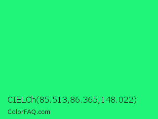 CIELCh 85.513,86.365,148.022 Color is a normal green color and the nearest color is Spring Green #00ff7f. Hex code #20f57a and RGB value is rgb(32,245,122). In RGB color space, this color is composed of 13% red, 96% green, 48% blue, In CMYK color space, this color is composed of 87% cyan, 0% magenta, 50% yellow , 4% black , In HSL color space, this color has a hue angle of 145° , 91% saturation and 54% lightness.