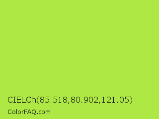 CIELCh 85.518,80.902,121.05 Color is a normal green color and the nearest color is Conifer #acdd4d. Hex code #ade845 and RGB value is rgb(173,232,69). In RGB color space, this color is composed of 68% red, 91% green, 27% blue, In CMYK color space, this color is composed of 25% cyan, 0% magenta, 70% yellow , 9% black , In HSL color space, this color has a hue angle of 82° , 78% saturation and 59% lightness.