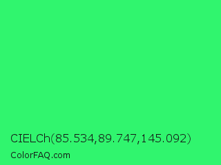 CIELCh 85.534,89.747,145.092 Color is a normal green color and the nearest color is UFO Green #3cd070. Hex code #30f56e and RGB value is rgb(48,245,110). In RGB color space, this color is composed of 19% red, 96% green, 43% blue, In CMYK color space, this color is composed of 80% cyan, 0% magenta, 55% yellow , 4% black , In HSL color space, this color has a hue angle of 139° , 91% saturation and 57% lightness.
