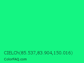 CIELCh 85.537,83.904,150.016 Color is a normal green color and the nearest color is Spring Green #00ff7f. Hex code #14f582 and RGB value is rgb(20,245,130). In RGB color space, this color is composed of 8% red, 96% green, 51% blue, In CMYK color space, this color is composed of 92% cyan, 0% magenta, 47% yellow , 4% black , In HSL color space, this color has a hue angle of 149° , 92% saturation and 52% lightness.