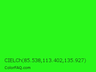 CIELCh 85.538,113.402,135.927 Color is a normal green color and the nearest color is Neon Green #39ff14. Hex code #29f71a and RGB value is rgb(41,247,26). In RGB color space, this color is composed of 16% red, 97% green, 10% blue, In CMYK color space, this color is composed of 83% cyan, 0% magenta, 89% yellow , 3% black , In HSL color space, this color has a hue angle of 116° , 93% saturation and 54% lightness.