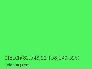 CIELCh 85.548,92.158,140.596 Color is a light green color and the nearest color is Screamin Green #66ff66. Hex code #4df45e and RGB value is rgb(77,244,94). In RGB color space, this color is composed of 30% red, 96% green, 37% blue, In CMYK color space, this color is composed of 68% cyan, 0% magenta, 61% yellow , 4% black , In HSL color space, this color has a hue angle of 126° , 88% saturation and 63% lightness.