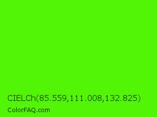 CIELCh 85.559,111.008,132.825 Color is a normal green color and the nearest color is Chlorophyll Green #4aff00. Hex code #52f505 and RGB value is rgb(82,245,5). In RGB color space, this color is composed of 32% red, 96% green, 2% blue, In CMYK color space, this color is composed of 67% cyan, 0% magenta, 98% yellow , 4% black , In HSL color space, this color has a hue angle of 101° , 96% saturation and 49% lightness.