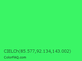 CIELCh 85.577,92.134,143.002 Color is a normal green color and the nearest color is UFO Green #3cd070. Hex code #3af565 and RGB value is rgb(58,245,101). In RGB color space, this color is composed of 23% red, 96% green, 40% blue, In CMYK color space, this color is composed of 76% cyan, 0% magenta, 59% yellow , 4% black , In HSL color space, this color has a hue angle of 134° , 90% saturation and 59% lightness.