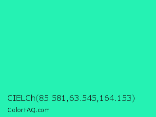 CIELCh 85.581,63.545,164.153 Color is a normal green color and the nearest color is Turquoise PWG #30d5c8. Hex code #25f2b3 and RGB value is rgb(37,242,179). In RGB color space, this color is composed of 15% red, 95% green, 70% blue, In CMYK color space, this color is composed of 85% cyan, 0% magenta, 26% yellow , 5% black , In HSL color space, this color has a hue angle of 162° , 89% saturation and 55% lightness.