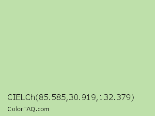 CIELCh 85.585,30.919,132.379 Color is a light green color and the nearest color is Sprout #c1d7b0. Hex code #bee0aa and RGB value is rgb(190,224,170). In RGB color space, this color is composed of 75% red, 88% green, 67% blue, In CMYK color space, this color is composed of 15% cyan, 0% magenta, 24% yellow , 12% black , In HSL color space, this color has a hue angle of 98° , 47% saturation and 77% lightness.