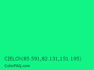 CIELCh 85.591,82.131,151.195 Color is a normal green color and the nearest color is Spring Green #00ff7f. Hex code #11f587 and RGB value is rgb(17,245,135). In RGB color space, this color is composed of 7% red, 96% green, 53% blue, In CMYK color space, this color is composed of 93% cyan, 0% magenta, 45% yellow , 4% black , In HSL color space, this color has a hue angle of 151° , 92% saturation and 51% lightness.