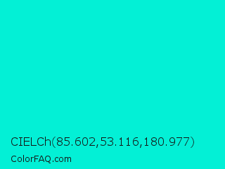 CIELCh 85.602,53.116,180.977 Color is a normal cyan color and the nearest color is Bright Turquoise #08e8de. Hex code #03f0d6 and RGB value is rgb(3,240,214). In RGB color space, this color is composed of 1% red, 94% green, 84% blue, In CMYK color space, this color is composed of 99% cyan, 0% magenta, 11% yellow , 6% black , In HSL color space, this color has a hue angle of 173° , 98% saturation and 48% lightness.