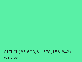 CIELCh 85.603,61.578,156.842 Color is a light green color and the nearest color is Medium Aquamarine #66ddaa. Hex code #59f0a6 and RGB value is rgb(89,240,166). In RGB color space, this color is composed of 35% red, 94% green, 65% blue, In CMYK color space, this color is composed of 63% cyan, 0% magenta, 31% yellow , 6% black , In HSL color space, this color has a hue angle of 151° , 83% saturation and 65% lightness.