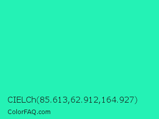 CIELCh 85.613,62.912,164.927 Color is a normal green color and the nearest color is Turquoise PWG #30d5c8. Hex code #24f2b5 and RGB value is rgb(36,242,181). In RGB color space, this color is composed of 14% red, 95% green, 71% blue, In CMYK color space, this color is composed of 85% cyan, 0% magenta, 25% yellow , 5% black , In HSL color space, this color has a hue angle of 162° , 89% saturation and 55% lightness.