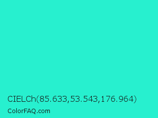 CIELCh 85.633,53.543,176.964 Color is a normal cyan color and the nearest color is Turquoise PWG #30d5c8. Hex code #27f0cf and RGB value is rgb(39,240,207). In RGB color space, this color is composed of 15% red, 94% green, 81% blue, In CMYK color space, this color is composed of 84% cyan, 0% magenta, 14% yellow , 6% black , In HSL color space, this color has a hue angle of 170° , 87% saturation and 55% lightness.